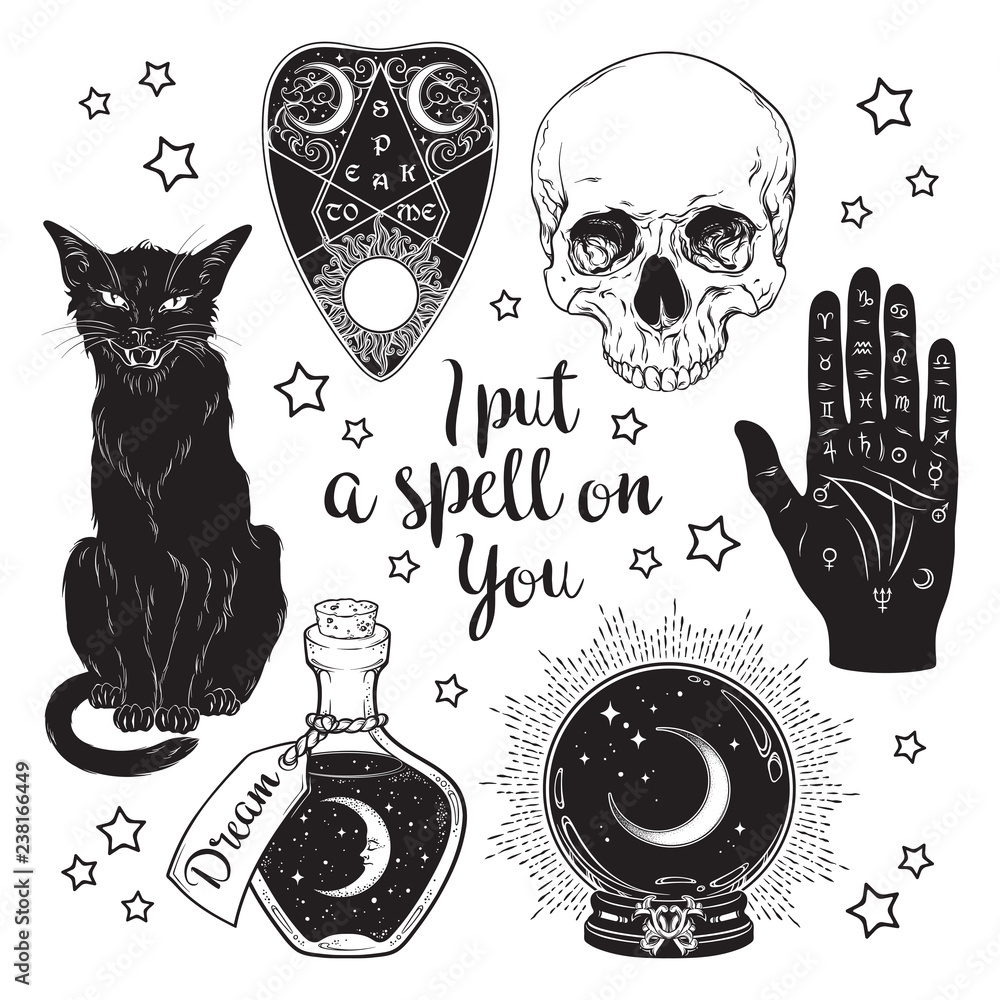 Magic Set Planchette Skull Palmistry Hand Crystal Ball Bottle And Black Cat Hand Drawn Art Isolated Ink Style Boho Chic Sticker Patch Flash Tattoo Or Print Design Vector Illustration Stock Vektorgrafik